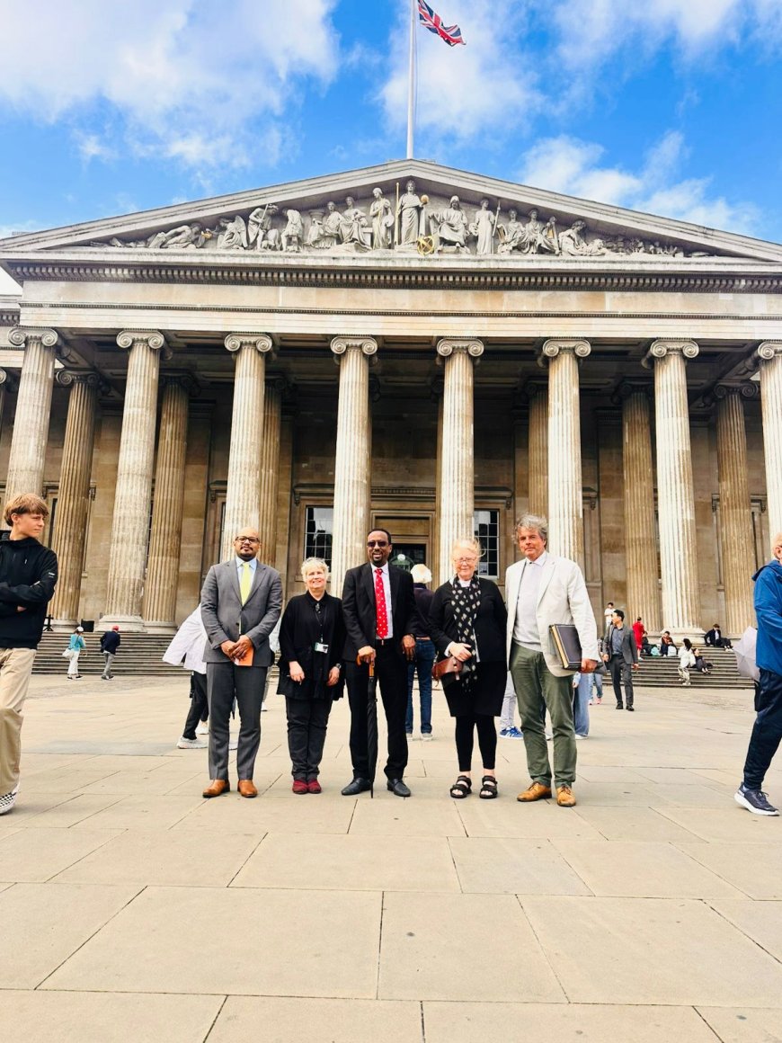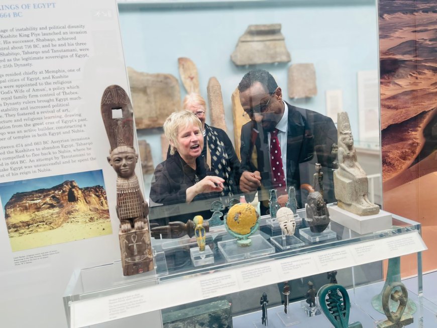 حيث تفقد مجموعة من الآثار السودانية المعروضة، برفقة السيدة جولي أندرسون، أمينة قسم السودان بالمتحف ورئيسة جمعية البحوث الأثرية السودانية، وبحضور كل من السيد مايكل مالينسون والسيدة هيلين مالينسون من مجلس المعماريين الملكي، الشريك الرئيسي في مشروع حماية التراث الحي في السودان، المنفذ بالشراكة مع المتحف البريطاني، وجامعة كامبريدج، والمعهد البريطاني لشرق إفريقيا، إلى جانب الأستاذ محمد أسامة إبراهيم، السكرتير الثاني ومسؤول الملف الثقافي بسفارة السودان لدى المملكة المتحدة.